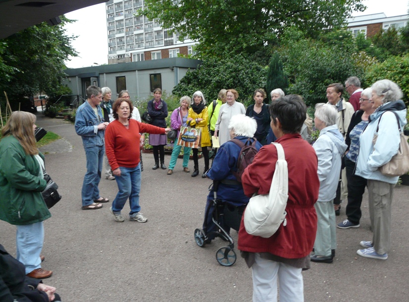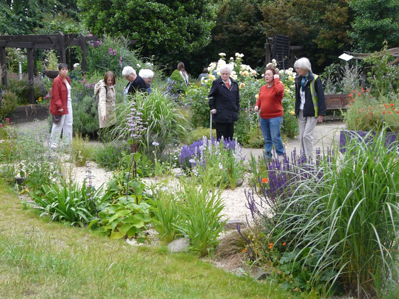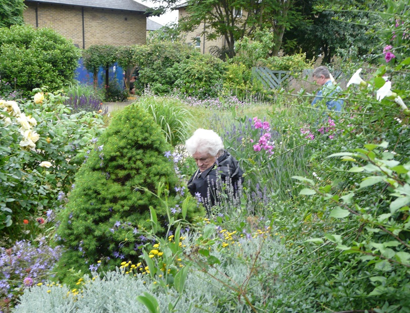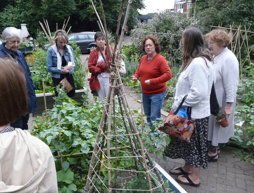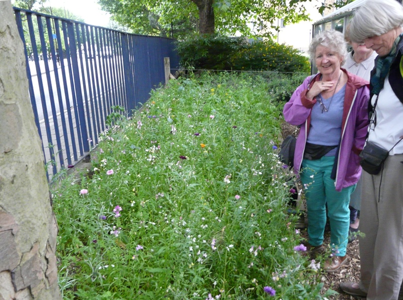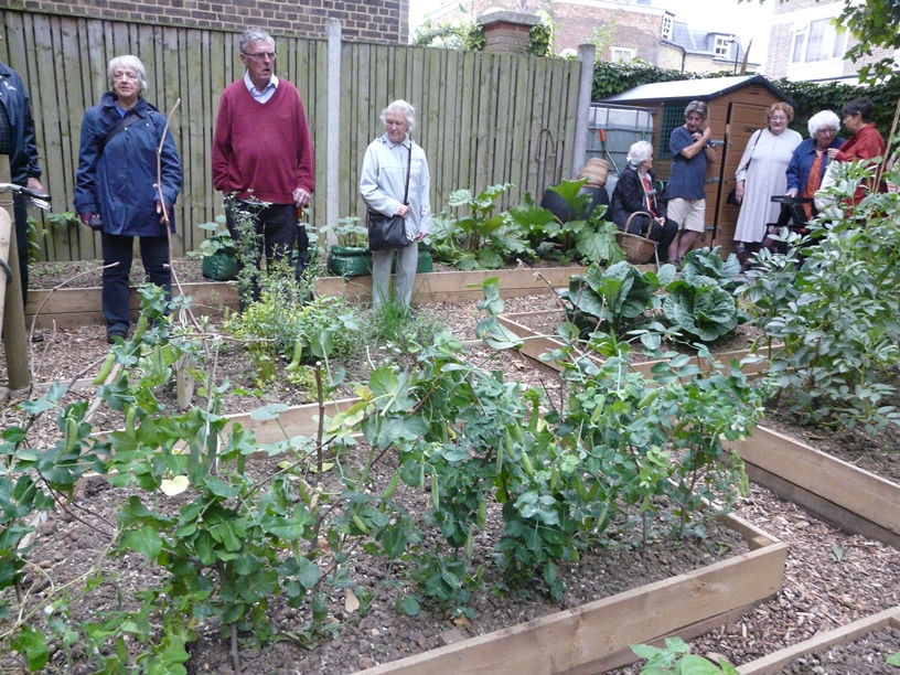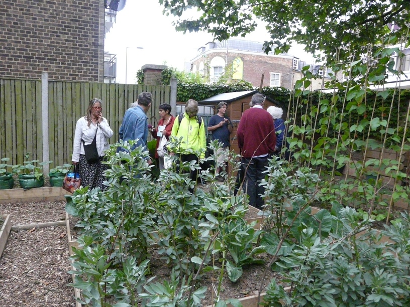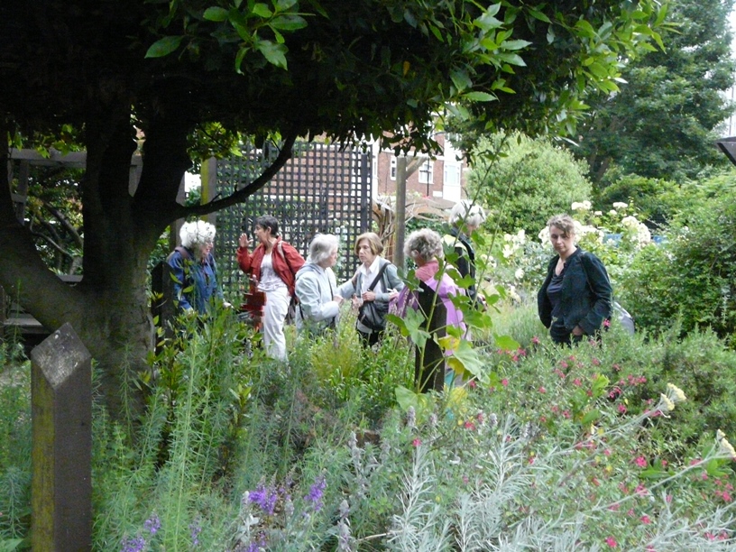 First up was Chris Levack’s community garden on the corner of Hoxton Street. Given space in the community garden by the housing association Chris has turned a forgotten corner of urban London into a very special garden. It’s an allotment in all but name – complete with greenhouse, meadow planting and plenty of healthy looking vegetables. The second location was St Mary’s Secret Garden where the lovely Paula Yassine gave us a private tour of the garden which was followed by drinks. The garden is completely fascinating and a great asset to the community. If you haven’t already been check out their website for opening times and special projects. Members took full advantage of all the well established plants on sale at very reasonable prices – another good reason to go!