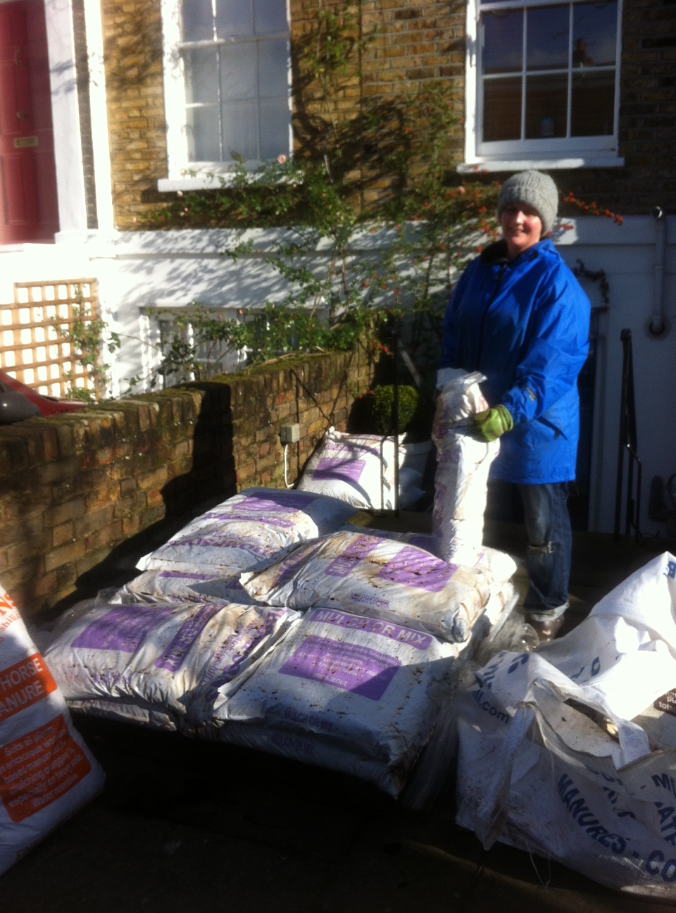 Amanda takes charge of a delivery from Thompsons of Crews Hill shared by five members in De Beauvoir. A total of 37 bags of Mix and Mulch will be spreading its way over gardens near you soon, along with a whiff of horse manure and a range of composts. If anyone else wants to share an order there are a few more members interested so shout if you want to be put in touch – the savings are good and the quality is excellent.