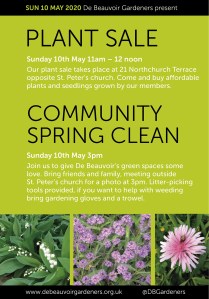 There is plenty to keep you in de Beauvoir on Sunday May 10th (Friday 8th is the bank holiday to celebrate VE day). We have our fabulous plant sale in the mornings o please get potting up self-seeded plants now. Last year the number and choice of plants was wonderful. Simply drop plants off at 21 Northchurch Road before 11am.