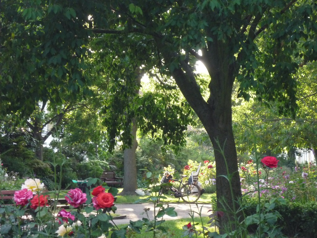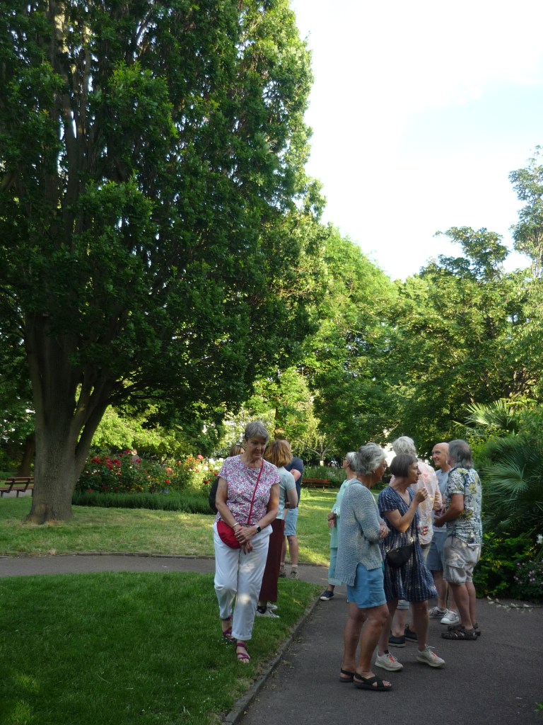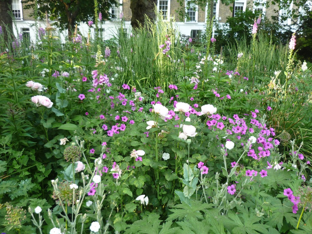 On a warm summer evening we held our June gardening meeting at Arlington Square Gardens in London N1. Paul Thompson and Gordon McArthur took us round the square pointing out some of the more unusual plants they have growing there. What amazed everyone was the sheer mass and variety, especially in the sunnier border, which is about three metres deep. Layer upon layer of shrubs, trees and herbaceous plants all co-exist happily. The dense planting is supported with a thick mulch of compost and the diversity of vegetation helps create a micro-climate in which the plants seem to thrive, even under a canopy of trees. The lesson we all took away – no bare earth – plant densely and be bold!