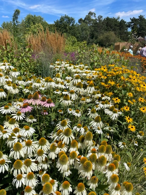 One of the benefits of being affiliated to the RHS is that our club can enjoy a free group visit to RHS gardens. We decided to visit RHS Hyde Hall in Essex two years ago but the pandemic got in the way. We finally got there this August and our visit coincided with the annual flower show so there was even more to see (and buy) than usual.