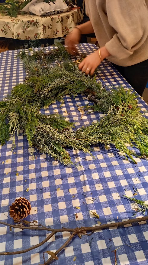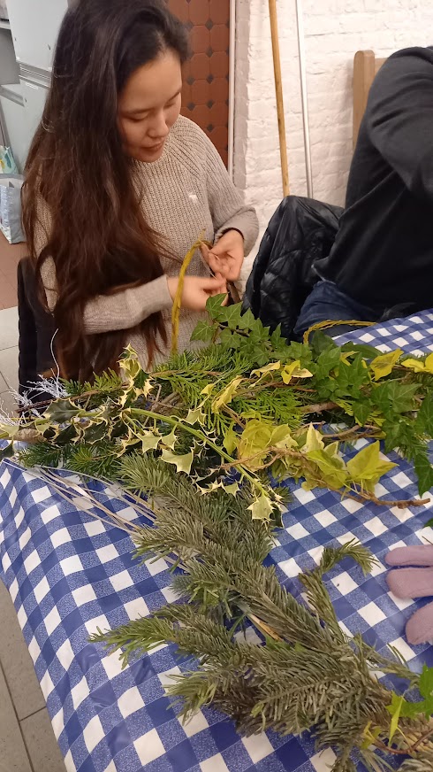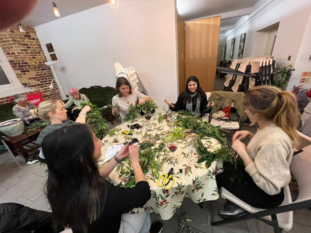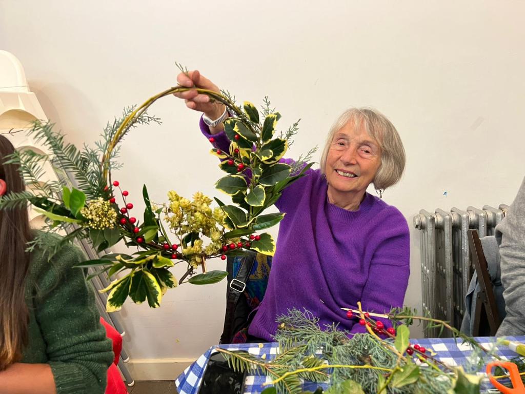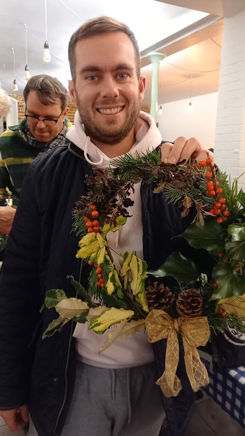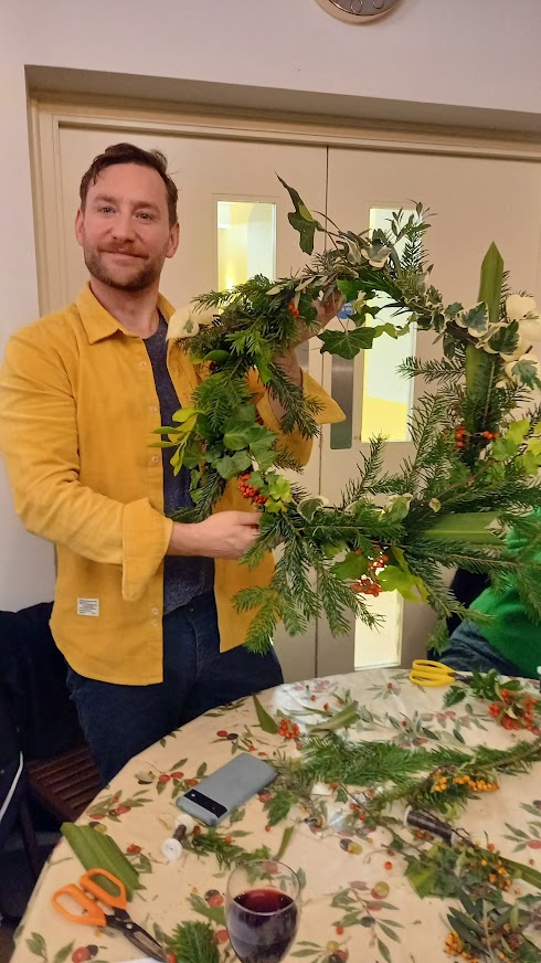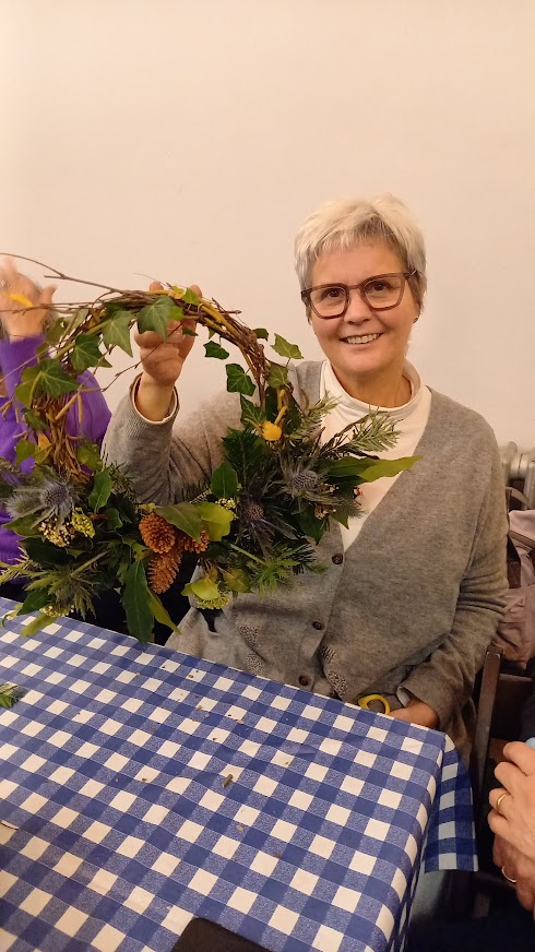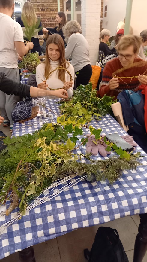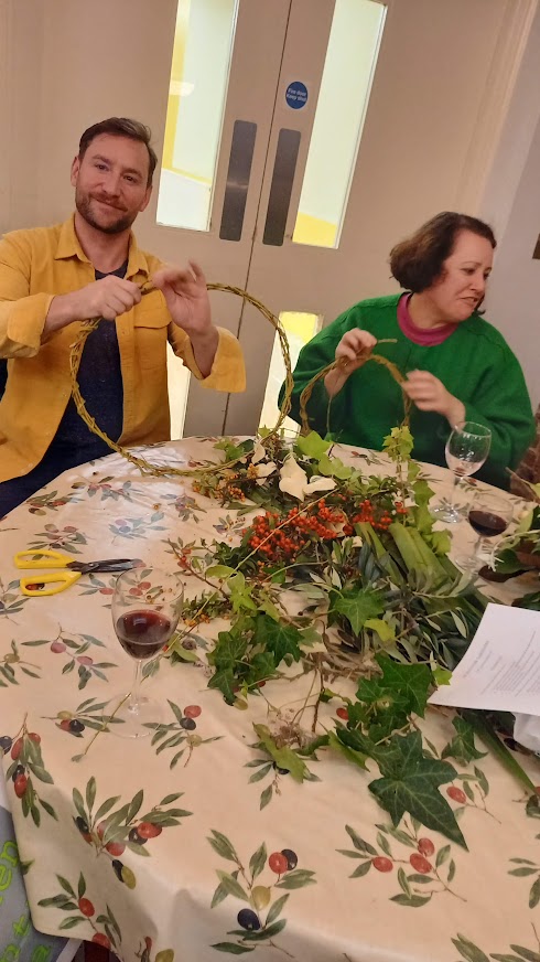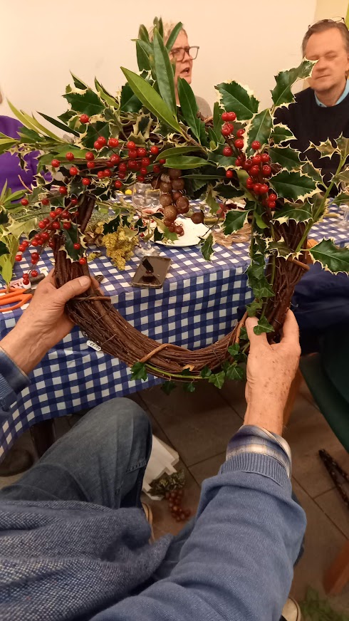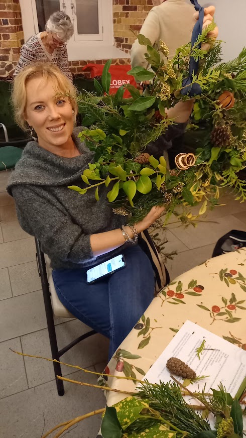 There wasn’t a spare seat in the house for our wreath making workshop on 6th December 2022. Issy Crossman from The Flower Appreciation Society led proceedings with a wreath demonstration and then it was down to everyone to have a go at making their own. Irene Slegt brought a huge pile of willow to weave into hoops and members brought a selection of greenery to share.