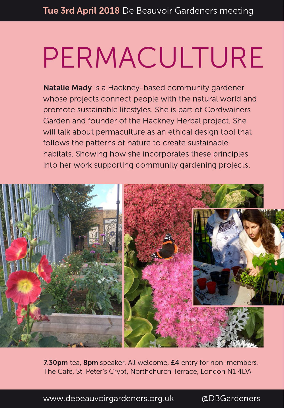 Nat Mady from Cordwainers will explain the principles of permaculture which leaves habitats undisturbed and reduces the work! Nat is also an expert on herbs.
