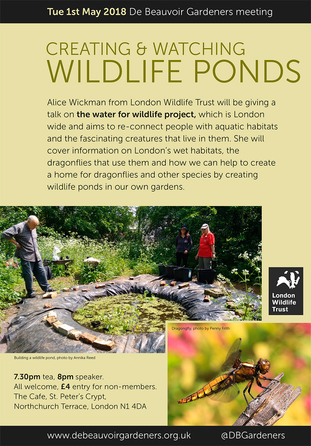 Alice Wickman from the London Wildlife Trust will talk about the benefits of garden ponds and what you can expect to see.