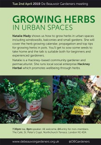 Natalie Mady is a Hackney-based community gardener and permaculturist. She runs local social enterprise Hackney Herbal which promotes wellbeing through herbs. The talk will be focused around growing herbs in urban spaces including windowsills, balconies and small gardens. It will cover an overview of the herb growing calendar, propagation and top tips for growing herbs in pots. You’ll get to sow some seeds to take home. The talk is suitable both for beginners and those who already have some gardening or growing experience. (Please bring a pot).