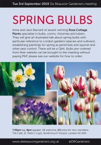 On 3 September Anne will talk to us about spring bulbs: with illustrations; and with particular reference to London gardens (species and cultivars); establishing plantings for spring as perennials, and squirrel and other pest control. She will take questions both during and at the end of the talk.