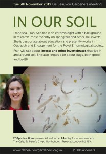Fransisca Sconce of the Royal Entomological Society will be talking to us about the science of insects. In particular the insects and other invertebrates that live in and around soil. She knows a lot about slugs, both good and bad(!)
