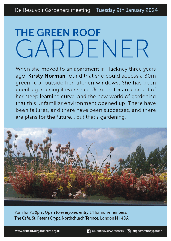 When she moved to an apartment in Hackney three years ago, Kirsty Norman found that she could access a 30m green roof outside her kitchen windows. She has been guerilla gardening it ever since. Join her for an account of her steep learning curve, and the new world of gardening that this unfamiliar environment opened up. There have been failures, and there have been successes, and there are plans for the future… but that’s gardening.