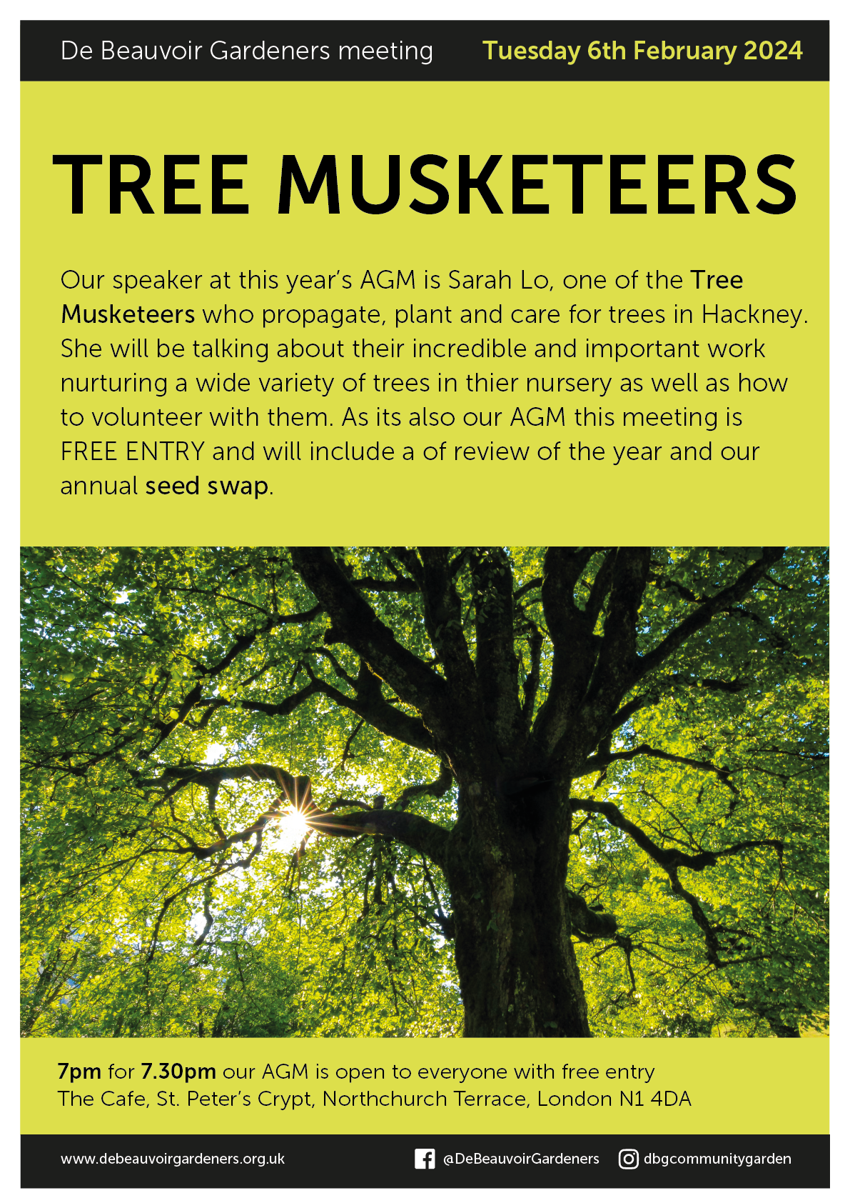Our Annual General Meeting is a quick summary of 2023 activities, a financial report and election of the committee. This year we are delighted to welcome a speaker from Hackney’s Tree Musketeers who are a group of volunteers who grow, plant and care for trees in Hackney.