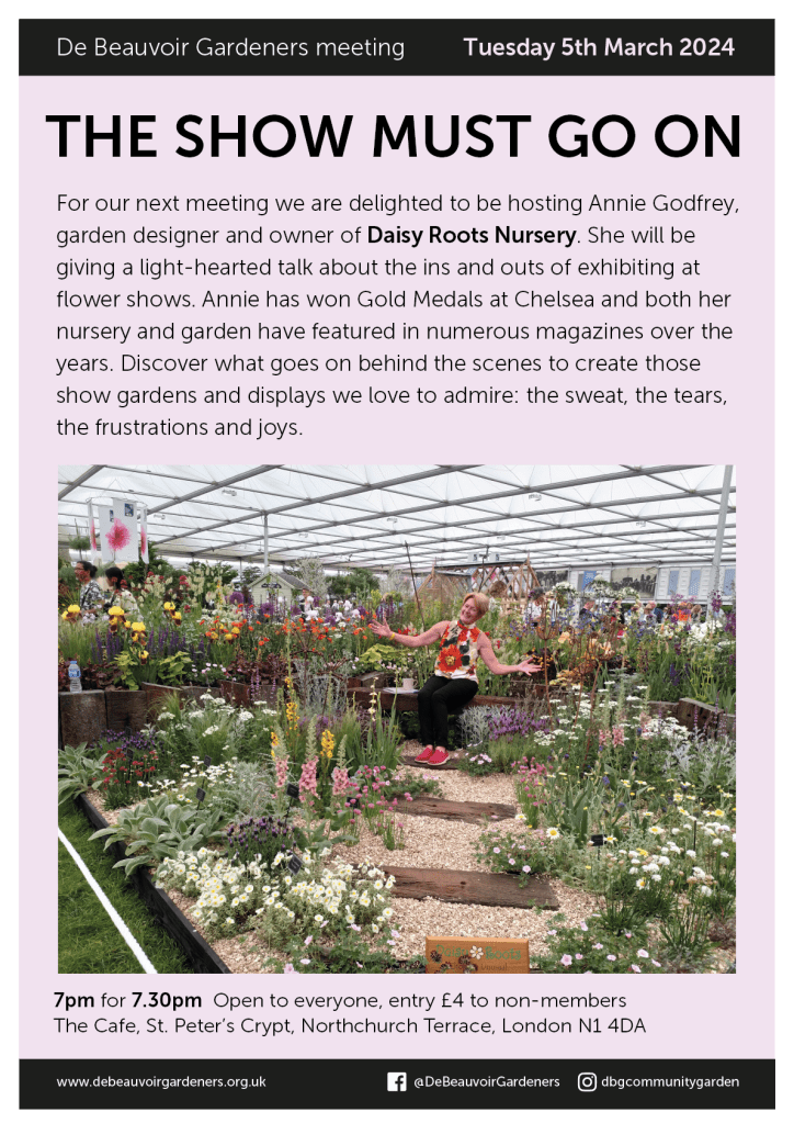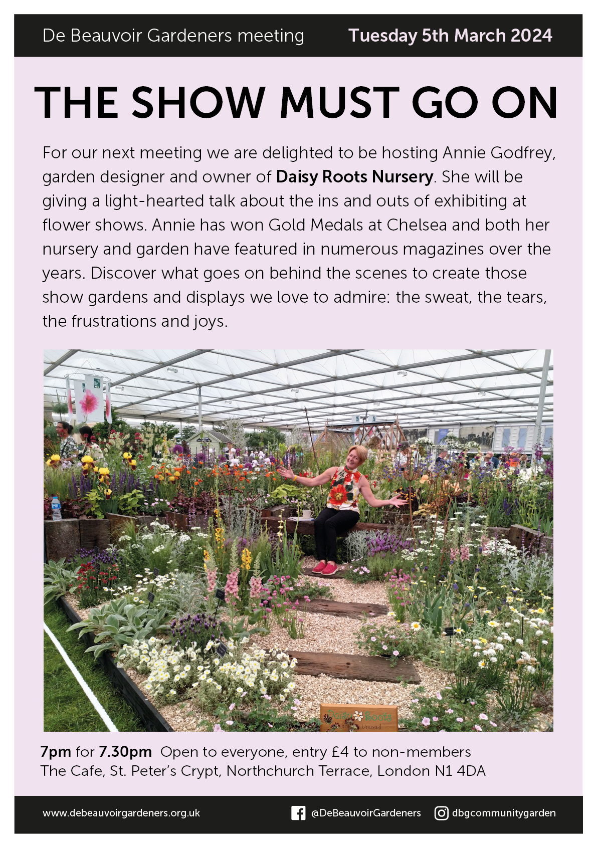 Annie Godfrey, Garden Designer and owner of Daisy Roots Nursery gives a light hearted talk about the ins and outs of exhibiting at flower shows.