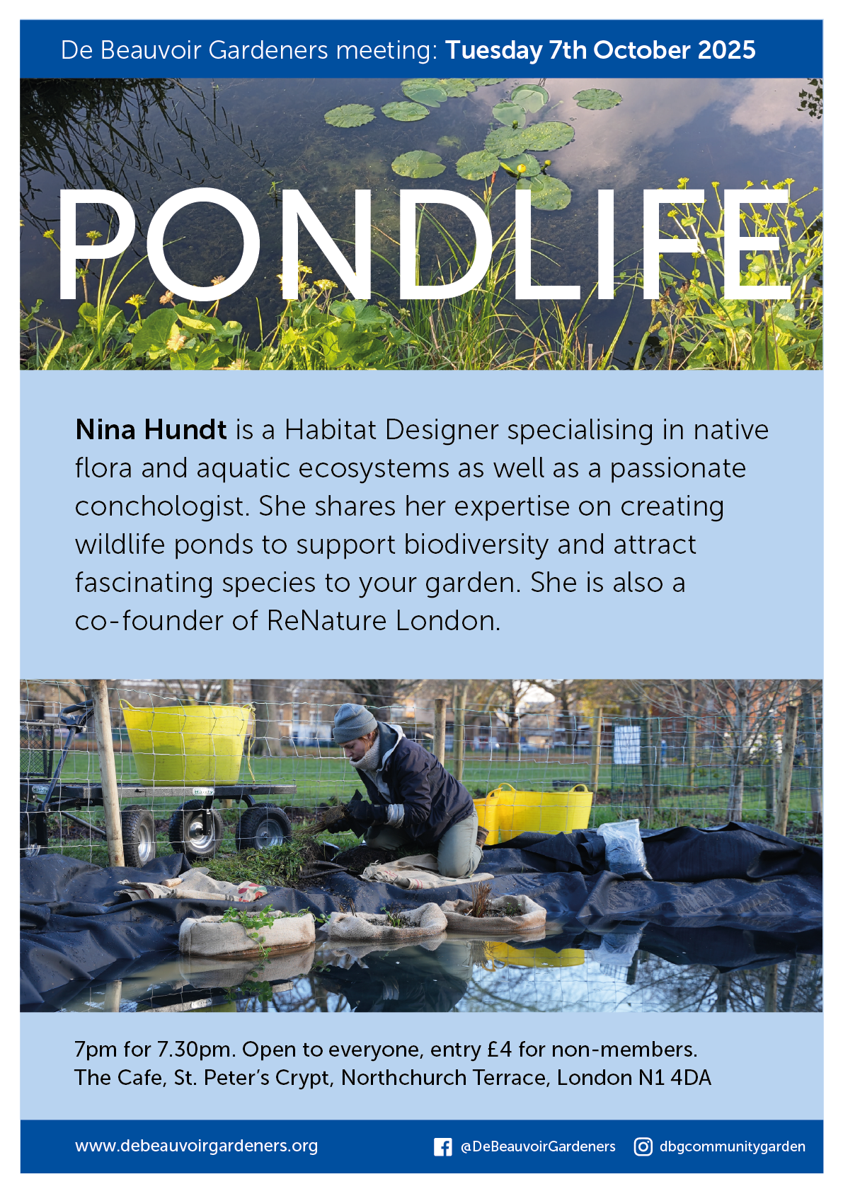 DBG member and wildlife gardener Nina is a founder member of ReNature London. She specialises in building sustainable, long term habitat restoration from the bottom up to enhance local wildlife. and this includes wildlife ponds.
