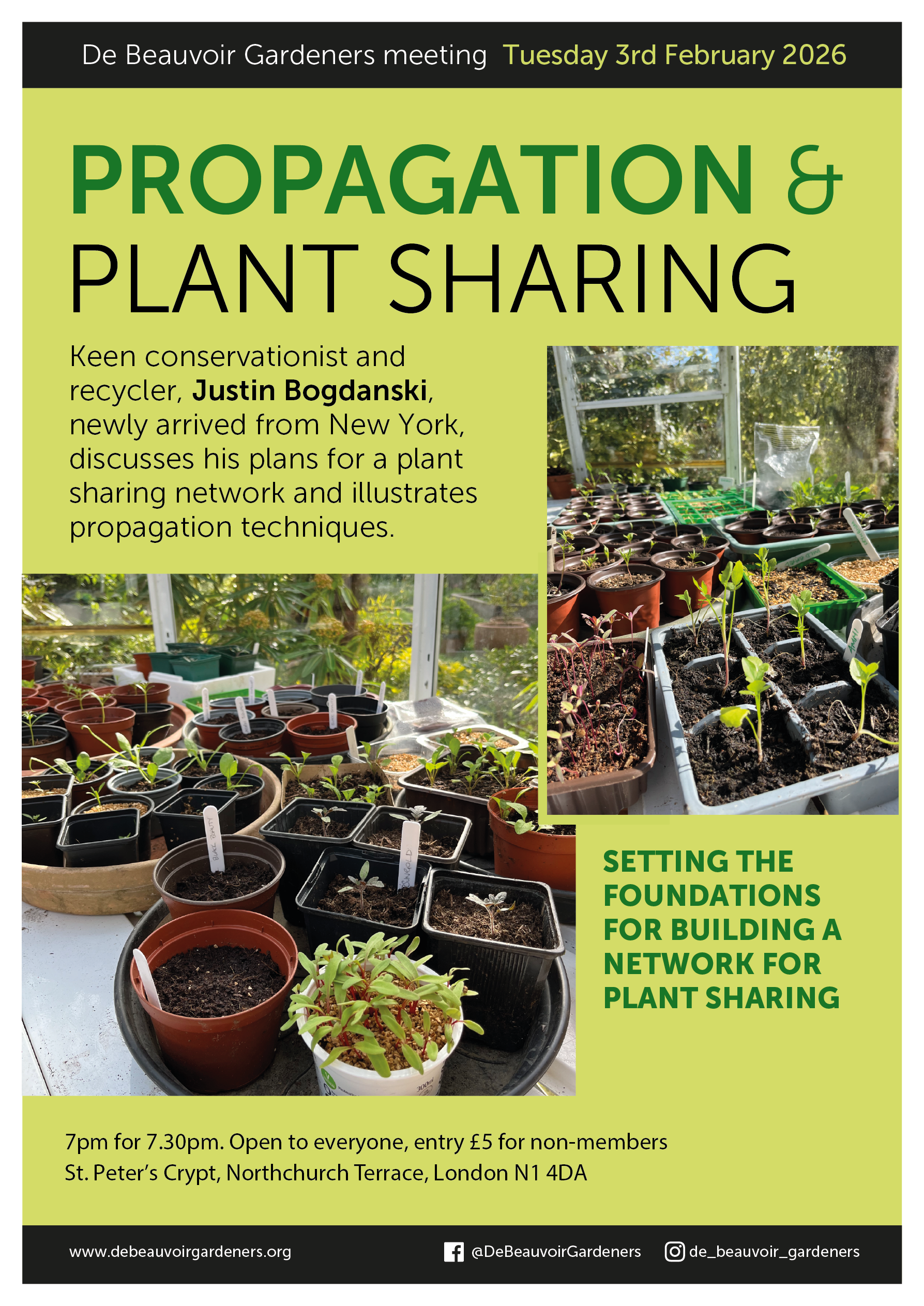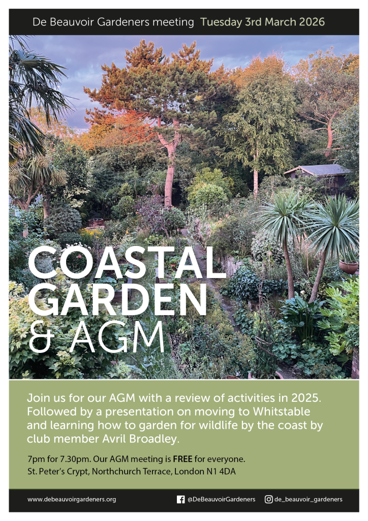 Meetings are 7pm for 7.30pm and are open to everyone, entry £5 for non-members (£2.50 for members of Islington Gardeners). Meetings are usually held in the cafe at St. Peter’s Crypt, Northchurch Terrace, London N1 4DA.