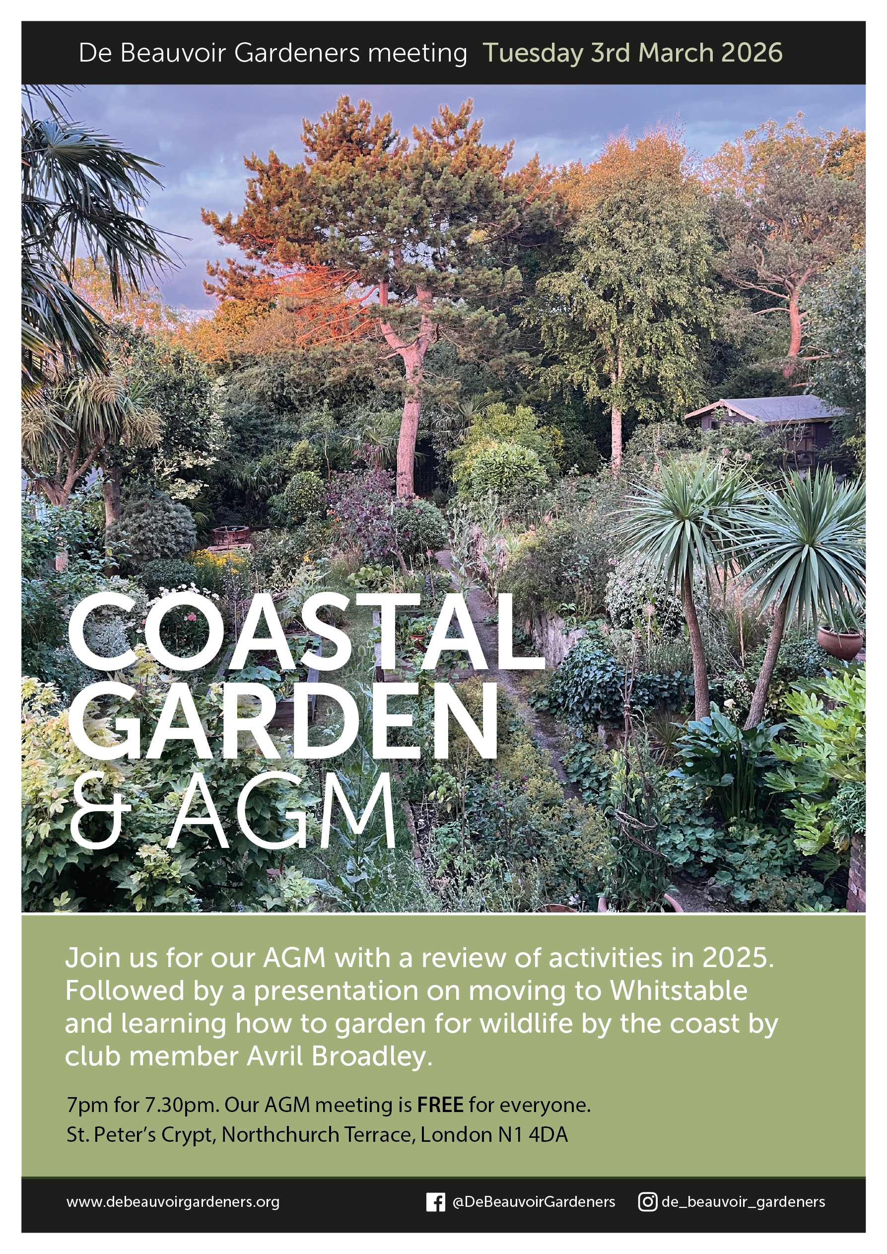 Its our AGM where we look back on the year and elect our committee. This year Avril will be giving a presentation on moving to Whitstable and learning how to garden for wildlife by the coast.